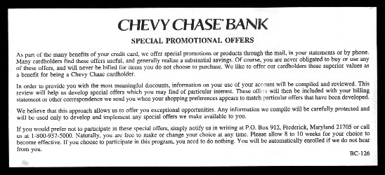 If you get a slip like this in the mail with your bill, call 1-800-937-5000 right away and ask to be on the "no-call list", otherwise be prepared to be telemarketed back to the stone age by Chevy Chase Bank. They are only allowed under federal law to call you once in any 12 month period.